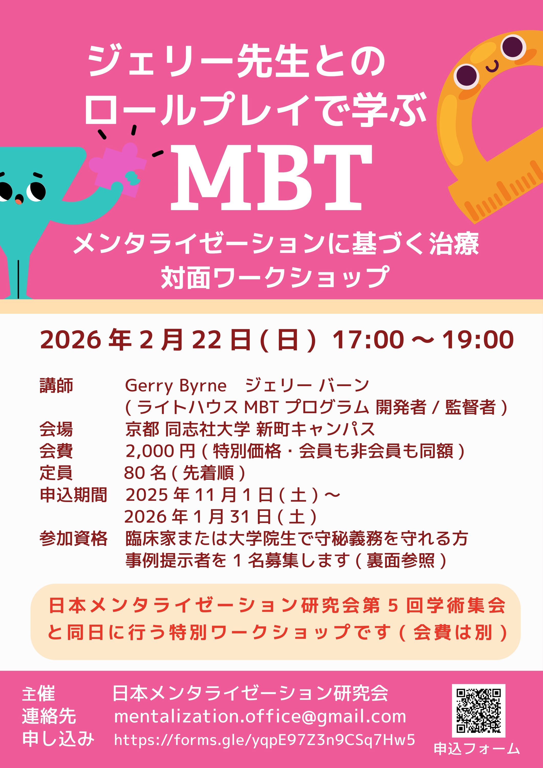 このたび、MBTスーパーバイザーをお迎えしてのワークショップを企画しました。どうぞご参加を検討ください。