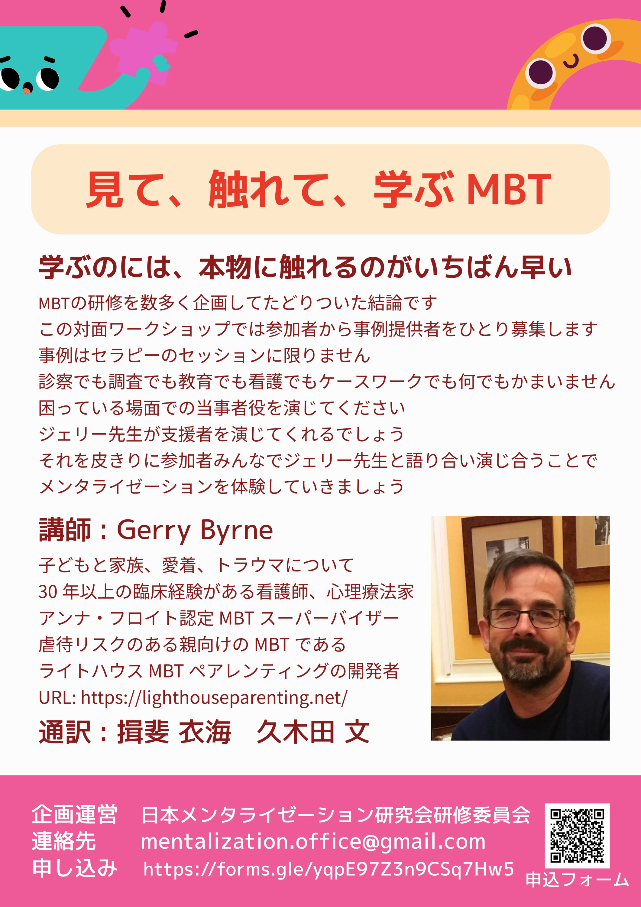 「ジェリー先生とのロールプレイで学ぶMBT メンタライゼーションに基づく治療 対面ワークショップ」が、京都で2026年2月22日(日)に開催されます。ジェリー先生は、子どもと家族、愛着、トラウマについて30年以上の臨床経験がある看護師、心理療法家であり、アンナ・フロイト認定MBTスーパーバイザー、虐待リスクのある親向けのMBTであるライトハウスMBTペアレンティングの開発者でもあります。